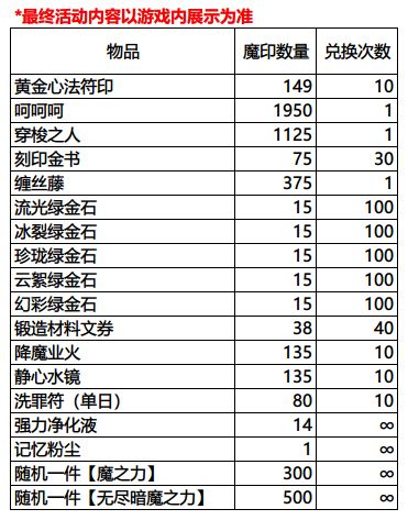 使用魔印兑换黄金心法符印、呵呵呵、60级套装锻造材料、刻印金书、锻造材料文券、暗魔套装等海量物品!