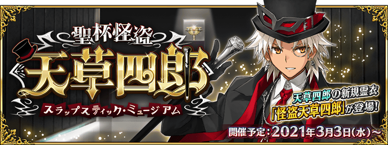 fgo日服将在3月3日开启2021年的白色情人节主题活动,不过本次活动并没有新从者落地。这次的主题是圣杯怪盗天草四郎主题活动,包括了天草四郎的新灵衣【怪盗天草四郎】。