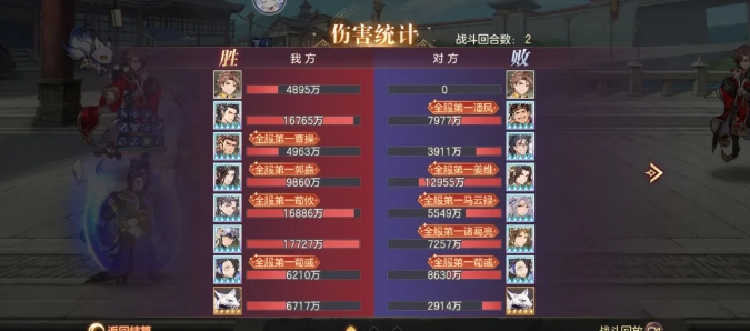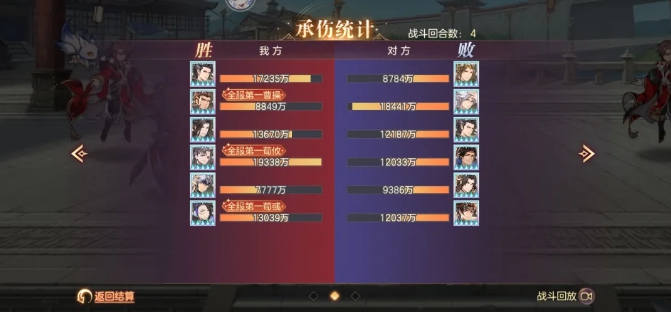 多核输出,阵容暴力。战斗成功拖入四回合,从承伤可以看出战况惨烈,魏国辅助将的回血远没有对方姜维邓艾吸血来的多,承伤方面惊人就不得不说到曹丕羁绊的减伤和福牛的盾起到了至关重要的作用。