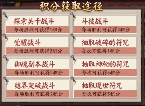 消耗积分,可以兑换四条不同路线的奖励,包括神秘的符咒、御行达摩碎片等。