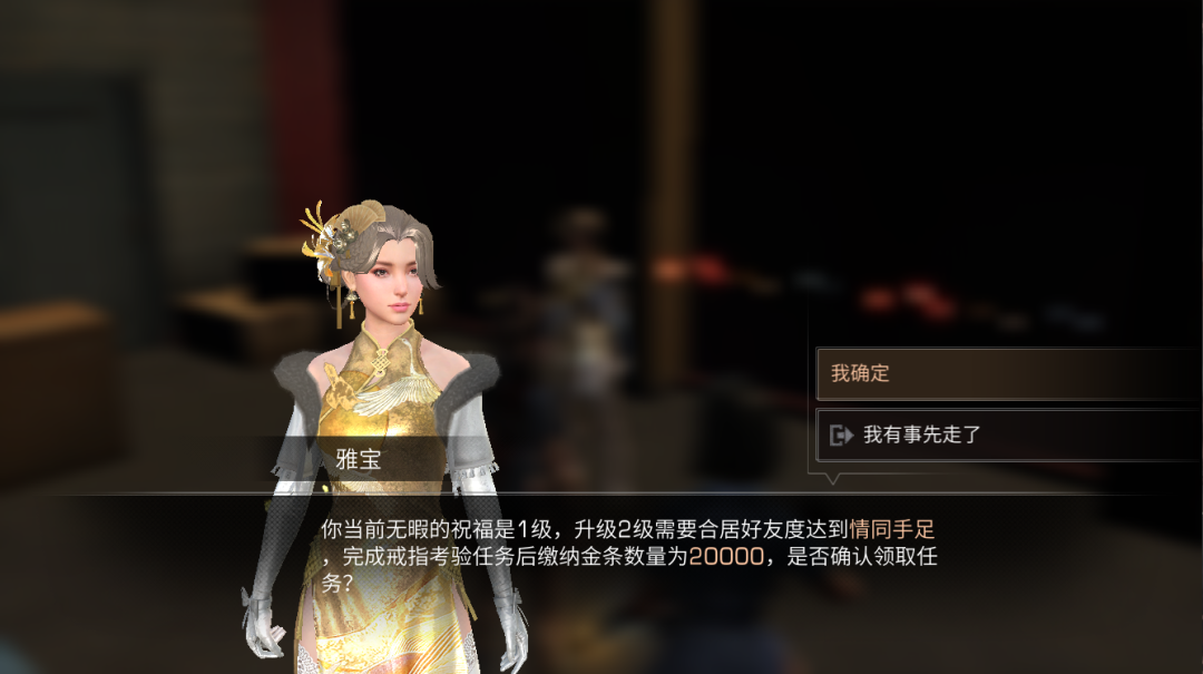 随着合居友好度的提升,可前往雅宝处花费一定金条升级戒指。