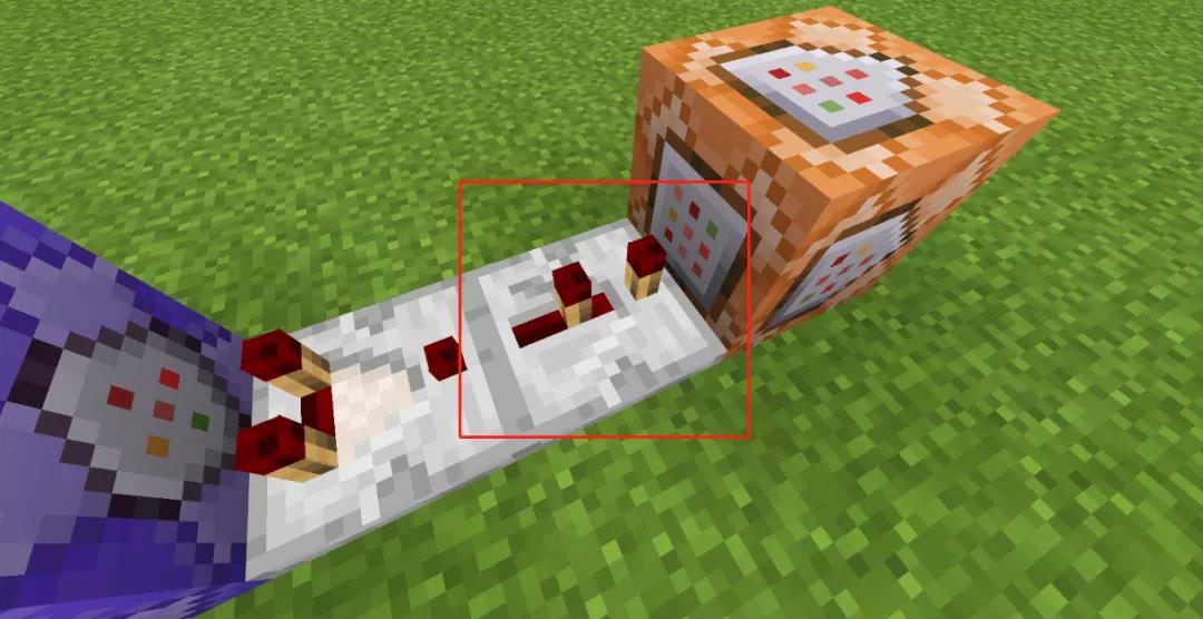 这个指令的完成,需要两个命令方块、一个红石比较器和一个红石中继器,按下图摆放好,要注意摆放的方向哦!