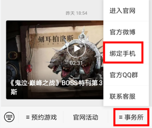 2、参与终极测试专属福利活动的恶魔猎人需要在活动页面登录,并在官方微信公众号鬼泣巅峰之战中的【公众号-事务所-绑定手机】处进行手机号的绑定,返回活动页面即可参与活动。