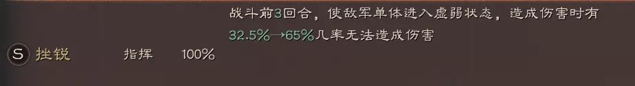挫锐+威谋靡亢:让【挫锐】的指向性虚弱目标提前给【威谋】开路,发动即可获得伤害收益,缺点是【挫锐】并非100%。