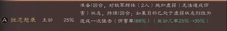 挫志怒袭+威谋靡亢:【挫志】算是【威谋】的降级版,两者综合使用可以使敌军更容易达成虚弱状态这个前置条件,从而让第二段伤害可以轻松打出来。