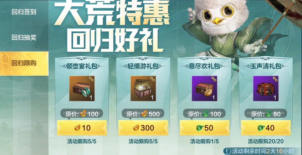 回归旅者的福利当然不是这么简单啦,折扣礼包不仅包含经验大餐、宠物礼包,更有贝币和苍玉的专属折扣礼。