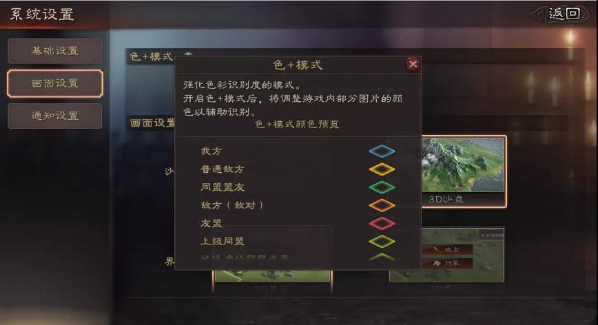 色+模式是针对游戏中部分色弱玩家所推出的模式,之前就收到不少色弱主公们反馈说:部分武将进阶和未进阶、敌对和友盟等分不清,在游戏中会有很多不便利的地方。