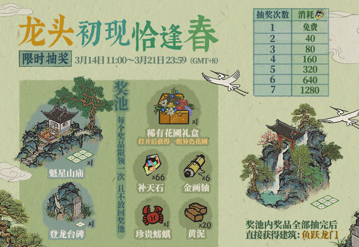 奖池内含龙头节活动建筑「登龙台碑」、「魁星山庙」、「稀有花圃礼盒」等奖励。奖池全部抽完后额外获得动态建筑「鱼跃龙门」。