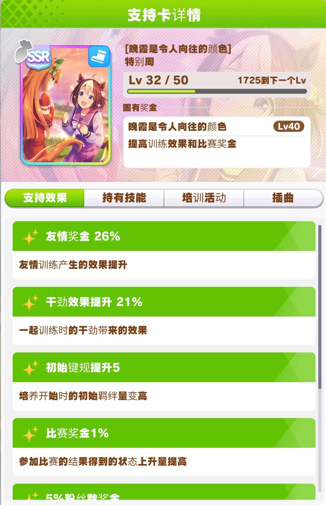 干劲效果提升;被安排到擅长训练的概率提升;一起训练提升的属性提高;培养开始时的初始属性提高。