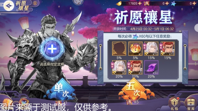 在祈愿禳星活动中,玩家可以选定陈宫或高顺进行招募,选择的武将会和其他材料一并进行抽取。