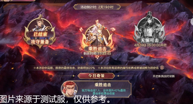 活动期间,分别在活动第1日,第3日,第5日分别开启【攻守兼备】、【乘胜追击】、【无懈可击】三个阶段的奇策挑战。在本活动中,陈宫、高顺的最终攻击、最终防御增加20%,并且本活动中所有武将的属性与养成将被调整为固定值。