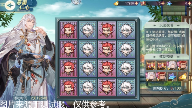 活动期间,每获得1点每日任务活跃度,即可同时获得1点活动积分,每消耗100点活动积分,即可在英杰赠礼活动中翻开一张卡片。卡片背面包含祈愿招募券、陈宫碎片、高顺碎片、祈愿星币、元宝等各种奖励。
