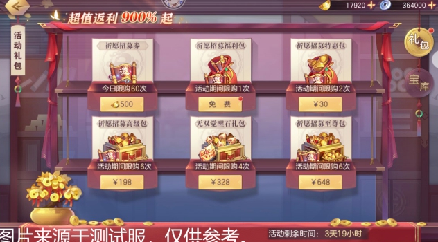 祈愿招募至尊包:内含祈愿招募券*60、元宝*6480,售价648元,活动期间限购6次。