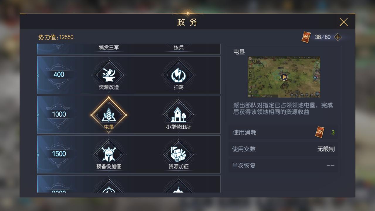【屯垦】是游戏中比较实用的获得资源的方式之一,玩家可以派出部队对指定的已占领领地屯田,从而获得对应的领地资源,屯垦的次数是无限制的,但是需要消耗政令。提高3%的屯垦收益使得玩家在前期可以获得更多的资源。