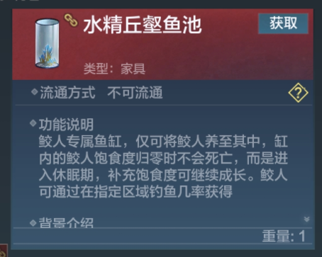 鲛人专属鱼缸,仅可将鲛人养至其中,缸内的鲛人饱食度归零时不会死亡,而是进入休眠期,补充饱食度可继续成长。