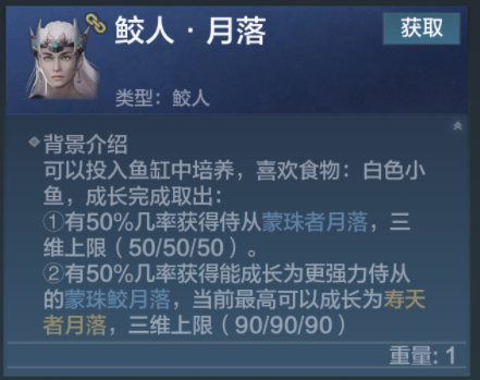 有50%几率获得能成长为更强力侍从的蒙珠鲛月落,当前最高可以成长为寿天者月落,三维上限( 90/90/90 )。