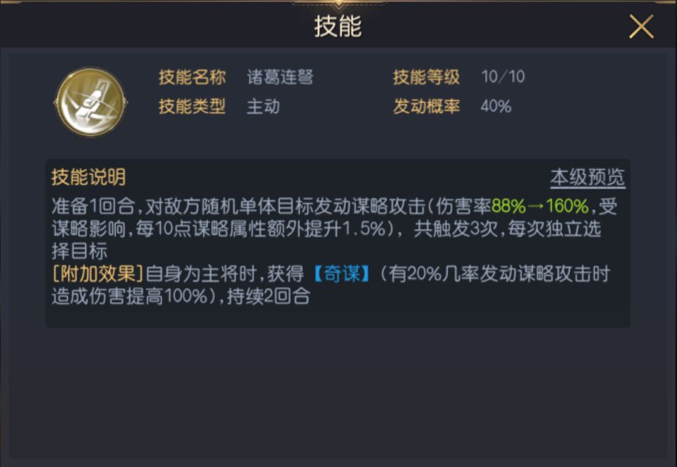 该技能还有一个附加效果:自身为主将时,获得20%【奇谋】几率(发动谋略攻击时,造成伤害提高100%)持续2回合。虽然这个几率不算很高,但是获得【奇谋】之后,每一次触发技能时都可以计算【奇谋】概率,这也意味着诸葛亮的输出上限空间将提高很多。