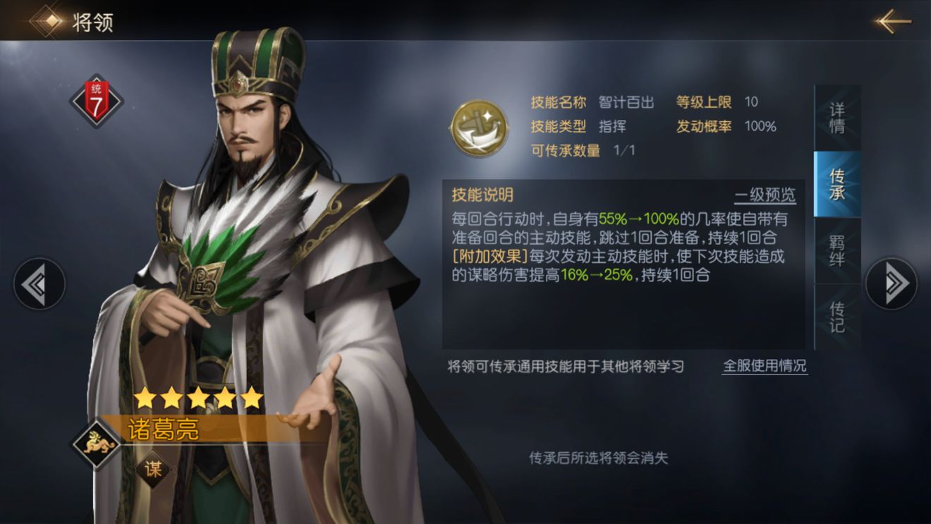 诸葛亮的传承技能是【智计百出】,这是一个发动几率为100%的指挥型技能,技能效果为:每回合行动时,自身有55%的几率(满级为100%)使自带有准备回合的主动技能,跳过1回合的准备,持续1回合;并且每次发动主动技能时,使得下1次技能所造成的谋略伤害提高16%(满级提高25%)。一些强力的谋略技能需要有相应的准备回合,而【智计百出】满级则可以跳过1个回合的准备,提高输出效率,同时还能提升后续技能的伤害能力。
