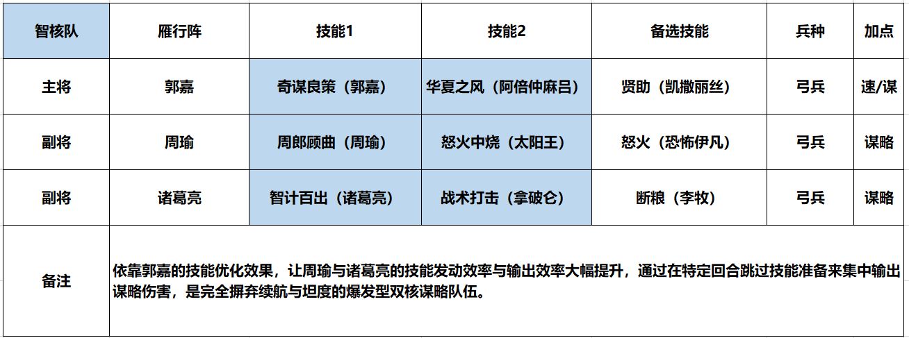 在阵容搭配时,推荐【诸葛亮+周瑜+郭嘉】,郭嘉为主将,周瑜和诸葛亮为副将。这套阵容以郭嘉为辅助型武将,给我方全体提供增益效果,以诸葛亮和周瑜作为主力输出。优势是速攻和爆发,而且还包含了单体攻击和群体攻击,战法发动速度快,发动概率高,可以在每回合都造成大量的谋略伤害。