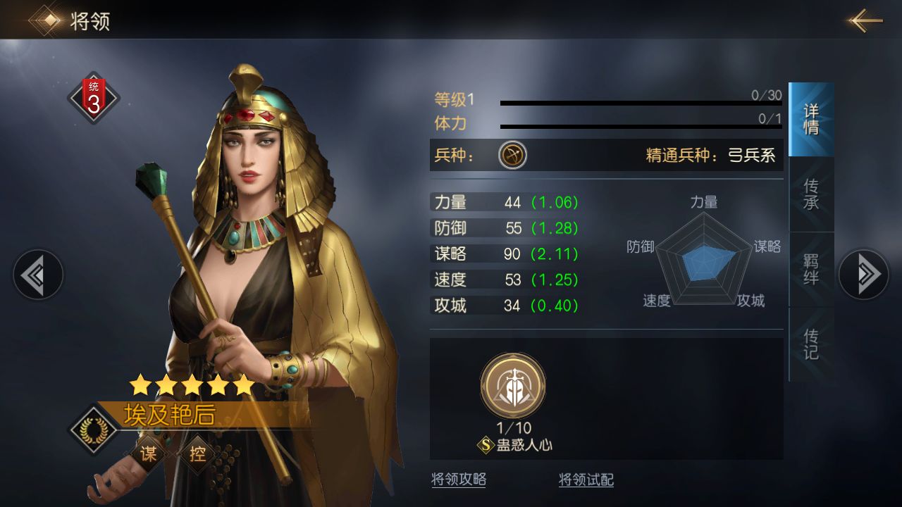 埃及艳后自带技能【蛊惑人心】。技能效果为:对敌方单体发动一次谋略攻击,伤害率为107%,满级为170%,并使其陷入【蛊惑】状态(普通攻击和技能攻击必定选择己方目标),持续一回合。【蛊惑】可以说是游戏中非常强的控制技能之一,让敌方将领自相残杀,被【蛊惑】的将领伤害,控制全部输出在自己的队友上,而我方将领则不会受到他的攻击。在己方不收到伤害的同时,又有效地打击了敌方。