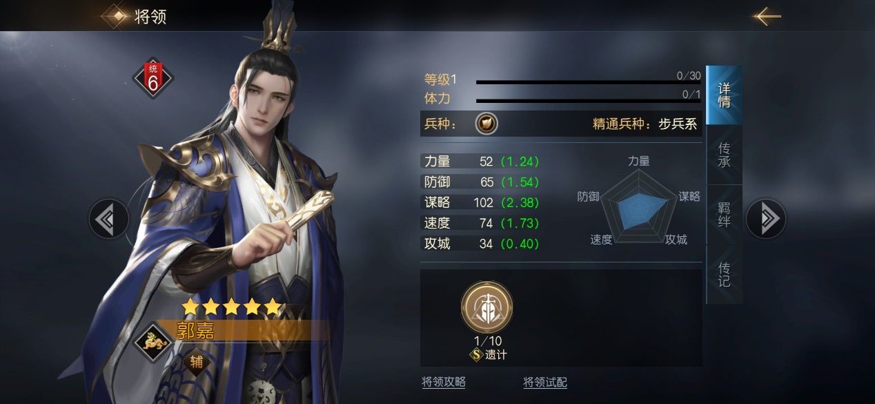 老规矩,先来看看郭嘉的基础属性,其中力量属性最差,物理防御能力中等,但其谋略属性和成长十分优秀,这也决定了其要走谋略加成的方向,另外值得注意的是,郭嘉的速度属性也算良好,这就意味着当其作为辅助,需要打出控制或者保护队友的技能时,能够有着较快的出手速度,在与其他队伍的对战中抢占先机。同时因为其尚可的防御属性和极佳的谋略属性,可以携带一些吸引火力的嘲讽类技能,替队友分担伤害。