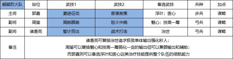 这里推荐给大家一种郭嘉的阵容搭配,如上图所示。队伍由2输出+1辅助将领组成,其中郭嘉负责对诸葛亮和周瑜进行辅助,主要是提供一定的治疗效果。这支队伍最大的特点是将领的谋略输出能力强悍,且多个技能具有灼烧效果,能够造成持续的伤害。正如上面所说的,如果更加激进一点,可以将【怒火中烧】作为郭嘉的备选技能,从而更好地激发队伍的持续伤害技能以及对敌人的持续减益效果。