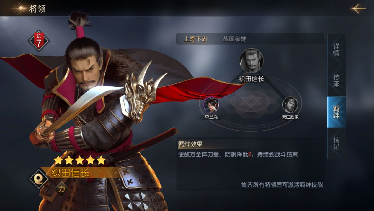 织田信长的可激活的羁绊阵容为:柴田胜家+森兰丸+织田信长,可触发【上恩下忠】,使敌方全体力量、防御降低2。