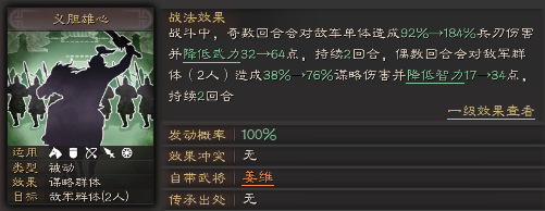 但若面对低统、低智的武将,则是超级输出。(比如姜维、夺魂、破阵,这种能够降低敌方属性的效果同时存在时,则效果会最大化)