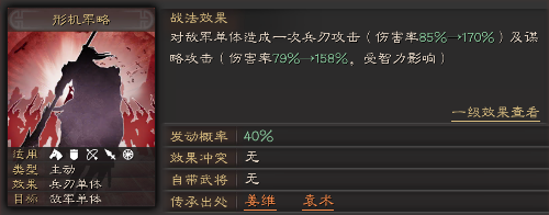 形机军略这个战法,伤害率十分之高,就伤害而言超越了往常的主动战法,比如落凤这类。由于携带者通常为武力、智力双高的武将,并且一般这类武将的属性上限比较有限,因此若面对敌方高智或高统的武将时,形机军略可能并非最佳的伤害战法。
