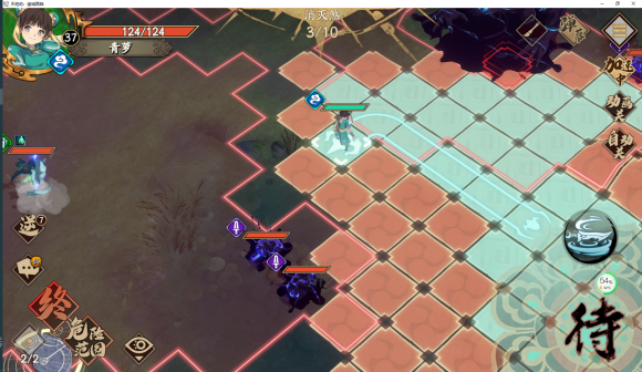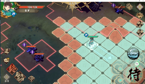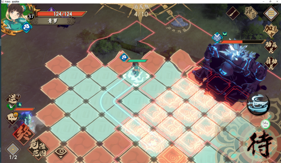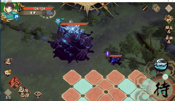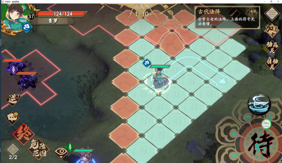 第五回合,法阵在危险范围内,因为还有一个法阵没踩,杀不了BOSS,青萝不能踩这个法阵,不然会被杀,游戏结束。