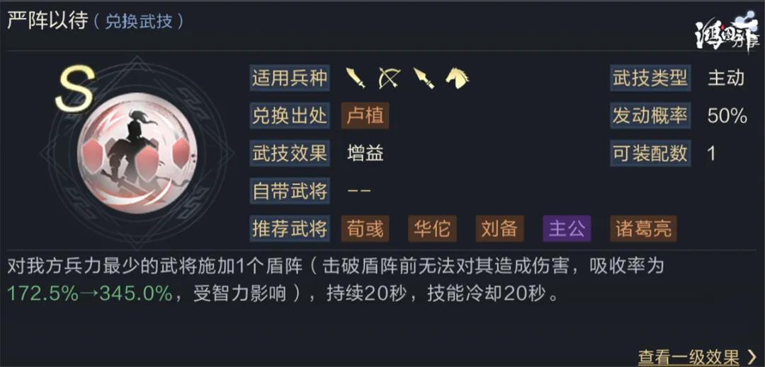 严阵以待是开荒期最佳的保护技能,可为兵力最低的角色提供高额盾阵,345%的吸收率能弥补低等级武将的智力成长问题,比恢复类武技降战损更明显,一般与通智令昏组合。