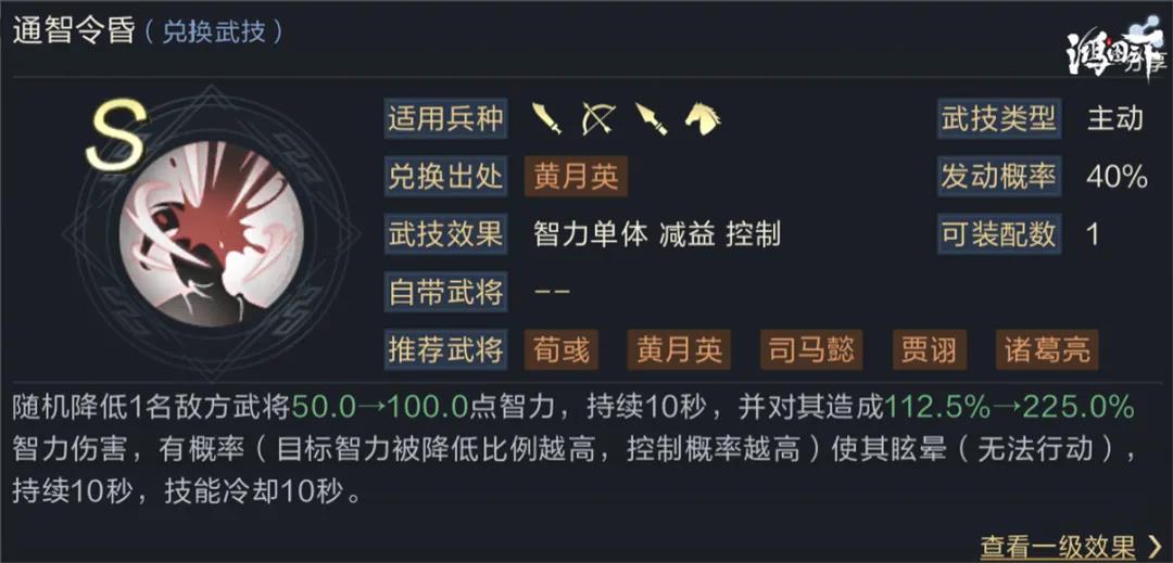 通智令昏的减值效果在前期对守军非常致命,7级地以前守军基本为紫将,基础智力与成长都较低,通智高达100点的减值效果能让后续的智力伤害打满,眩晕几率的提升也非常明显。