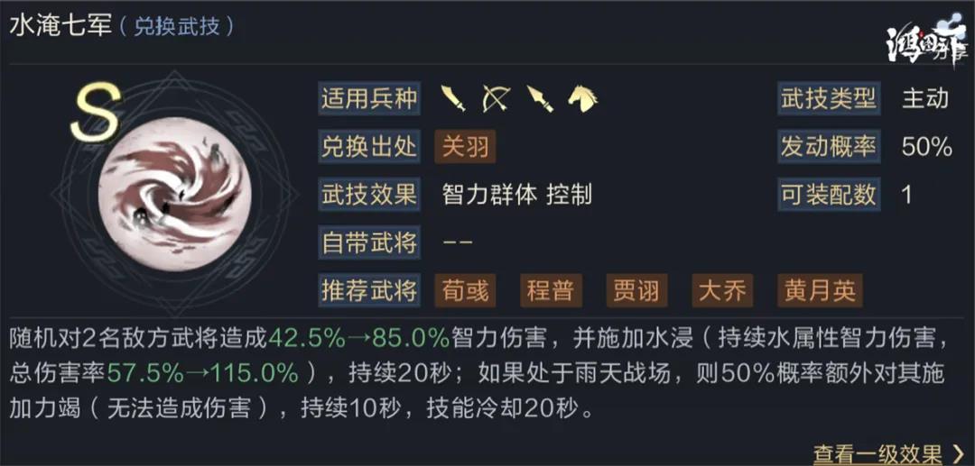 水淹七军本身有着200%的伤害率,前期守军大多无净化技能,可保证伤害打满,同时该技能在雨天有额外力竭效果,能较好的限制敌方技能造成伤害。