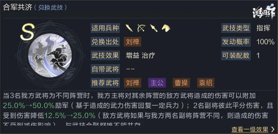 合军共济相当于优化了续航的合聚,虽然没有的固定的暴击几率与整体减伤,但主将可获得50%的励军,副将也有伤害平摊和减伤效果,整体降战损效果也很显著。