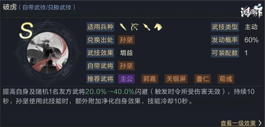 破虏可为携带者和随机队友提供闪避,发动率高,技能CD短都是它的优点,相比提升防御或减伤有更好的规避伤害效果,但有不稳定性。