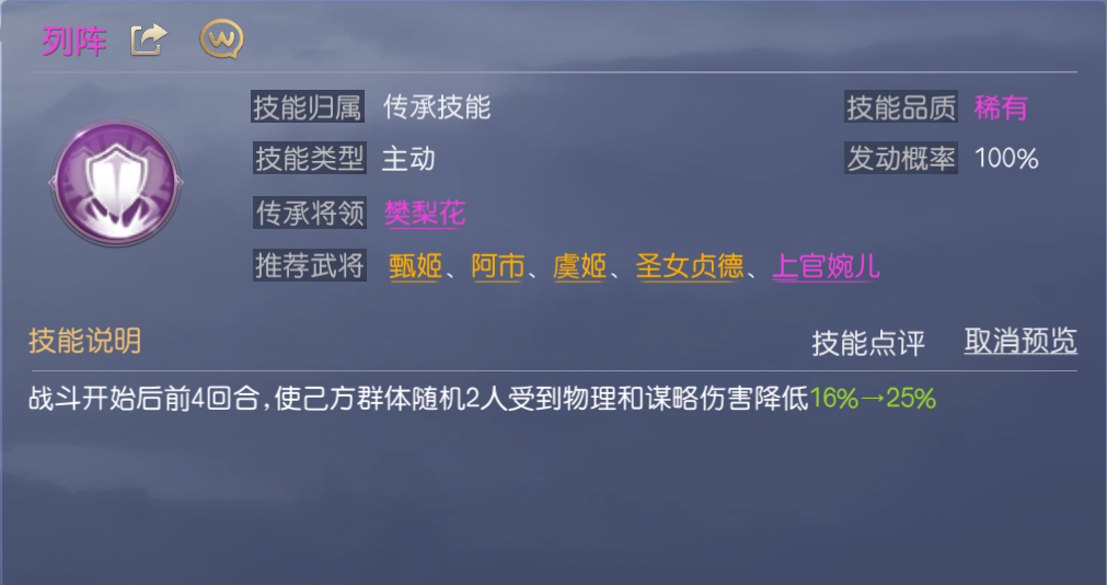 例如【列阵】,这个技能属于指挥型技能,在战斗开始后前4回合,使己方群体2人受到的物理和谋略伤害降低,也属于一个群体2人的辅助增益技能,满级可以减伤25%,可降低队伍整体承伤,搭配自身的恢复技能可显著提高队伍续航。