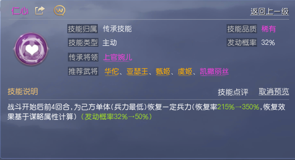 凯撒丽丝的传承技能也是【贤助】,非常适合搭配给其他的辅助型将领。