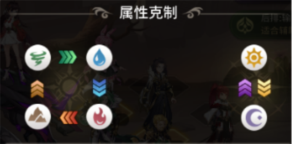 属性之间的基本克制关系为[风克水,水克火,火克地,地克风,光暗互克]。被克制时,受克制一方暴击率-10%,且有50%概率触发弱击,触发时伤害效果降低30%。反之亦然。
