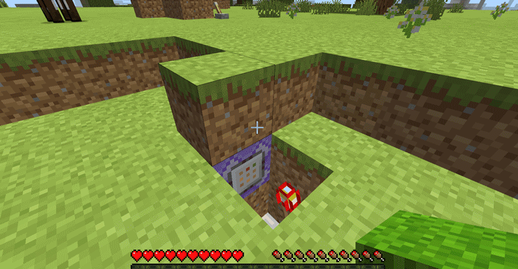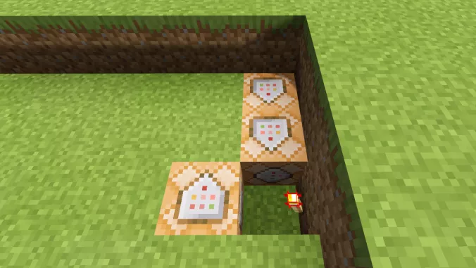 第一步拿到命令方块后,在屋子附近的地面挖一个1格深的L形坑并按照下图放上3个命令方块以及红石火把