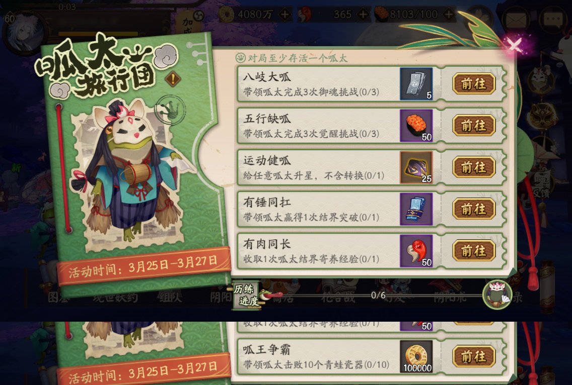 1.八岐大呱:带领呱太完成3次御魂挑战