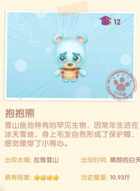 抱抱熊只会在晴朗的白天刷新,其他时间是钓不到抱抱熊的。