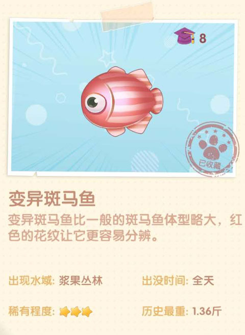 变异斑马鱼作为在摩尔庄园手游中生活在美丽的浆果丛林的可爱生物其中一位,相信很多小伙伴都想要跟变异斑马鱼做朋友吧!那么就让小编告诉你关于它的详细情报吧!