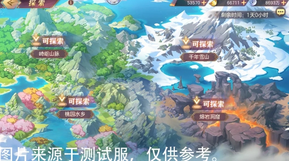 活动期间,玩家可点击【探索】进入玩法地图,完成【崎岖山脉】、【千年雪山】、【桃源水乡】、【熔岩洞窟】四个区域的探索任务获得丰富奖励。根据线索提示选择正确的武将进行探索,则有额外奖励加成,探索完对应区域则会获得卷轴残页、锻造原石、高级锻造石、中级陨铁等随机奖励,卷轴残页可在藏宝阁中点亮对应幻武密卷碎片。
