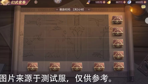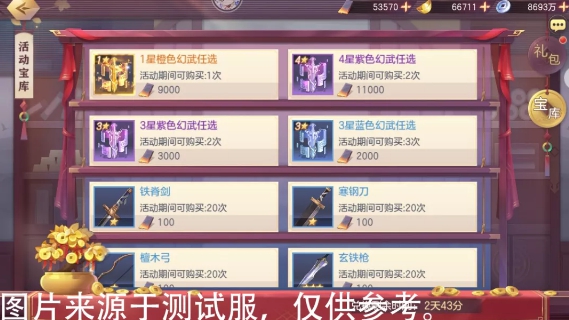 幻武宝库开放!活动期间,活动中获得的锻造原石可在活动宝库中兑换1星随机橙色幻武、4星幻武升星材料、3星幻武升星材料、高级陨铁等奖励。