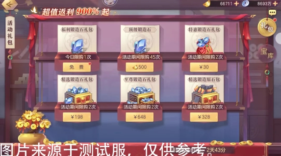 至尊锻造石礼包:含顶级锻造石*45,元宝*6480,售价648元,活动期间限购2次。