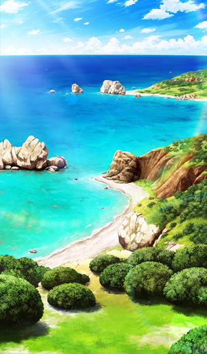 温和的海风。鸟儿们的鸣啭随风而来。大地被赋予富饶的恩惠,绿色的树林枝叶摇曳。波浪翻转,海岸的泡沫随着浪花美丽地飞舞。