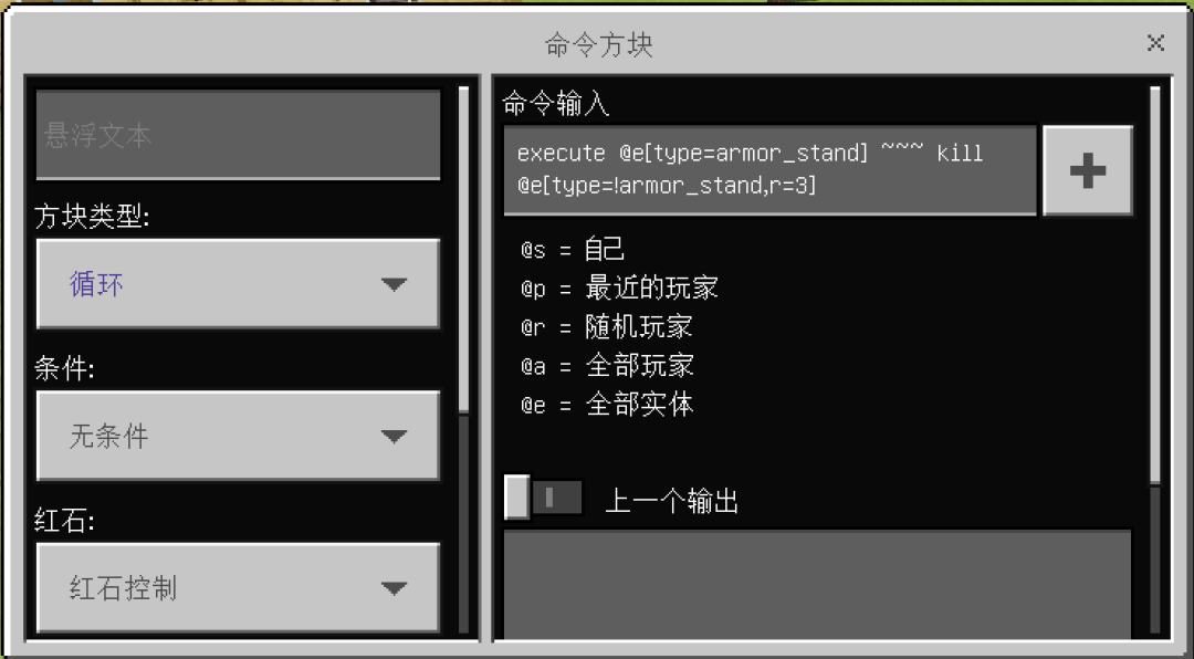 红石设为红石控制(消灭以盔甲架为中心半径3以内的除盔甲架以外的生物),最后埋好命令方块即可!