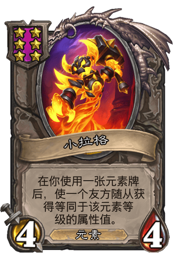 金卡效果:在你使用一张元素牌后,使一个友方随从获得等同于该元素等级的属性值,触发两次。
