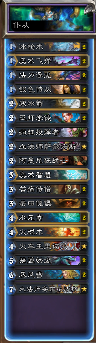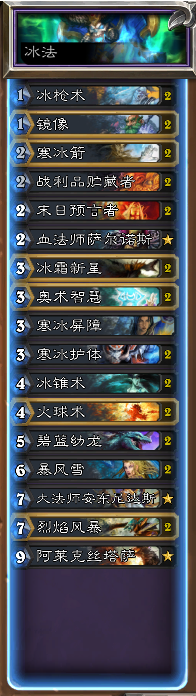 在快攻横行的环境中,依靠冰霜新星、寒冰屏障、冰锥术、暴风雪拖时间,烈焰风暴、末日预言者解场后,利用阿莱克丝塔萨配合火球术带走对面的构筑。
