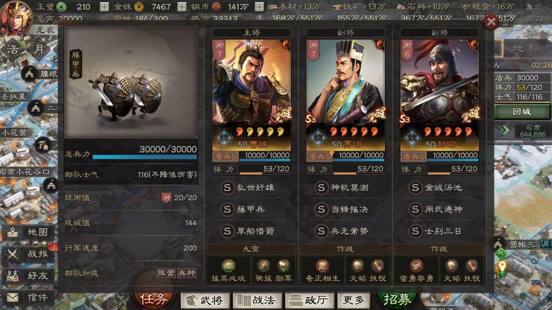 郝昭的技能和兵书选择也是考虑到队伍在穿多队的情况,还有整体队伍奶量和减伤比较充足,所以抛弃掉了传统的九变兵书,选择了作战兵书。通过蛮用非勇最大限度的利用好郝昭文武双全的面板,让郝昭原本不低的武力额外提供了更多的智力加成。